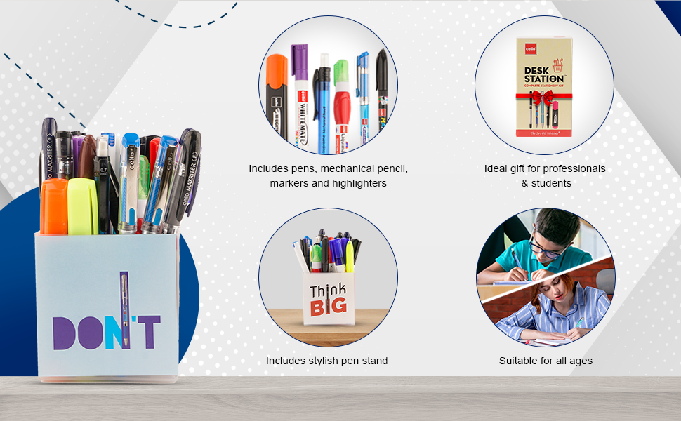 - Cello Desk Station stationery set is power packed with 23 assorted stationery items: 9 Ball Pens, 8 Markers, 4 Highlighters, 1 Correction Pen and 1 Mechanical Pencil.