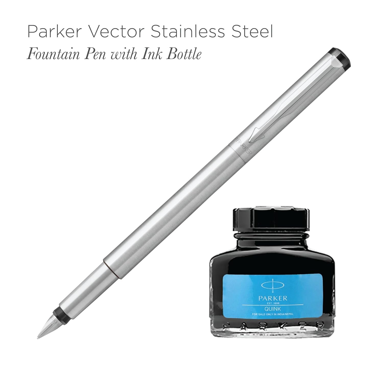 Parker Vector Stainless Steel Chrome Trim Fountain Pen Gift Set- with a free Ink Bottle and 3 Ink Cartridges | Blue ink | Fine Point | Ideal Gift Set for Professional and Students.